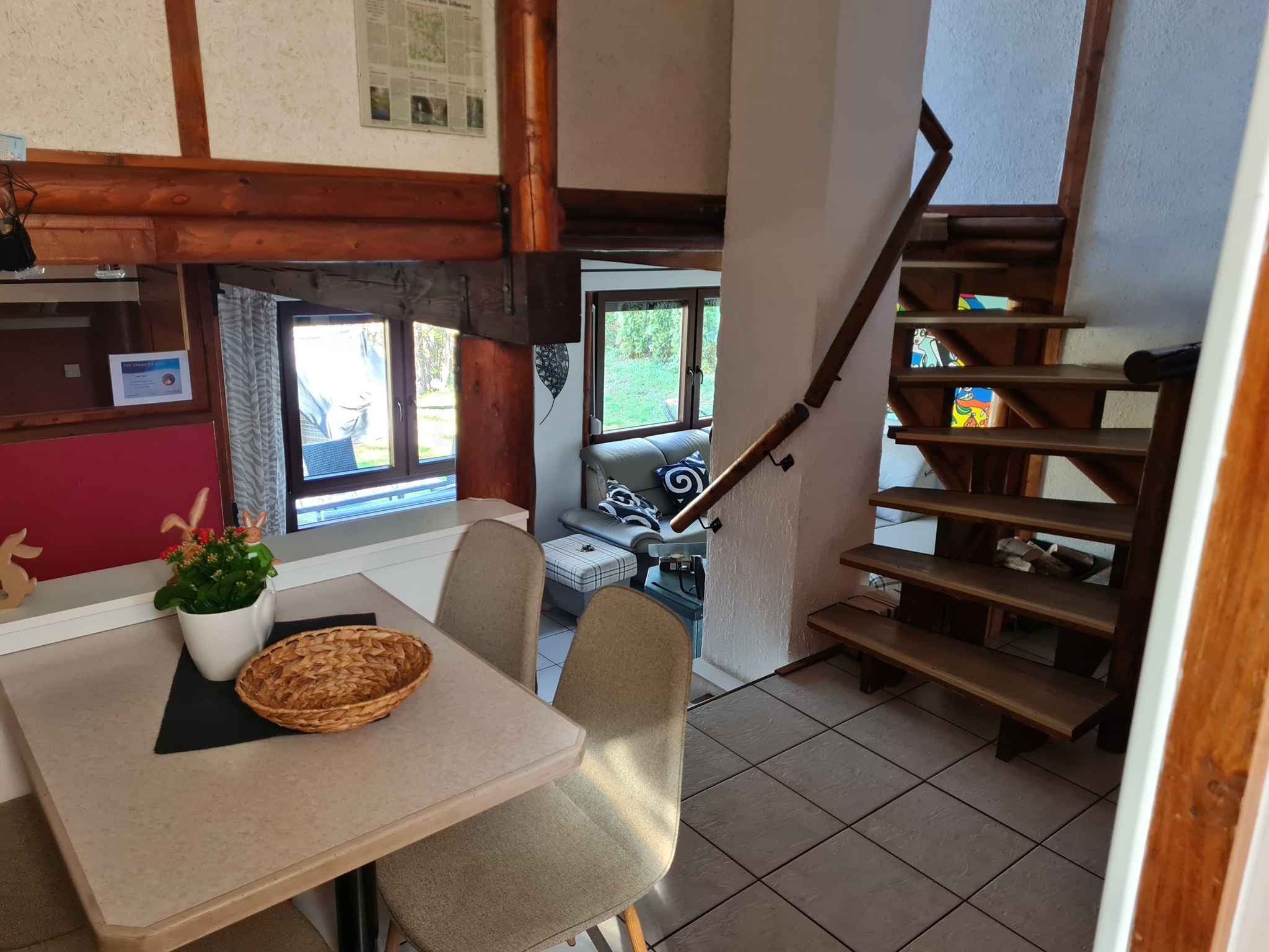 Hier steht Ihnen ein moderner Essplatz für 6 Personen mit 2 Stühlen und einer Eckbank zur Verfügung.